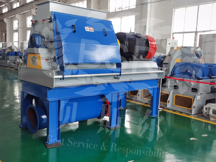 BSR多功能粉碎机主要用于处理经过撕碎机或者削片机处理的木料(物料尺寸要求为长度和宽度不大于3CM,厚度不大于2CM),可通过锤片将木料破碎至较小颗粒屑粉。主要是靠冲击能来完成粉碎物料作业的。粉碎机工作时,电机带动转子作高速旋转,物料均匀进入粉碎机腔中,高速回转的锤头冲击、剪切撕裂物料致物料被破碎,同时,物料自身的重力作用使物料从高速旋转的锤头冲向架体内挡板、筛条,在转子下部设有筛板、粉碎物料中小于筛孔尺寸的颗粒通过筛板排出,大于筛孔尺寸的物料阻留在筛板上继续受锤子的打击和研磨,直到破碎至所需颗粒大小最后通过筛板排出机外。